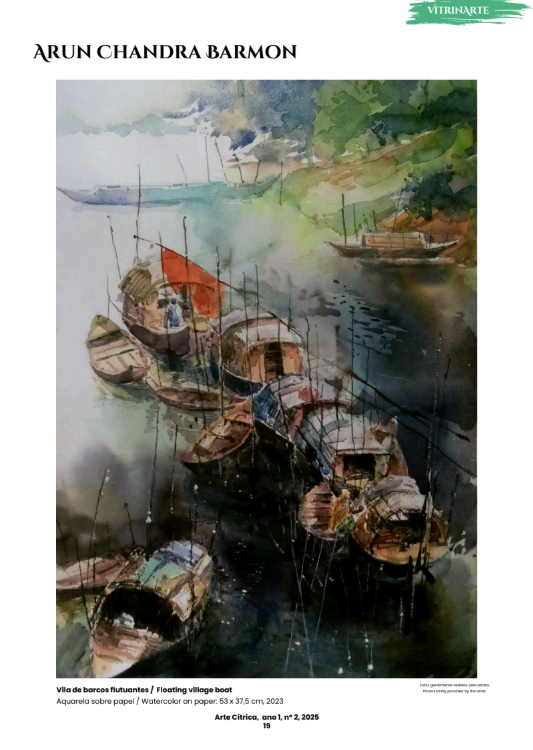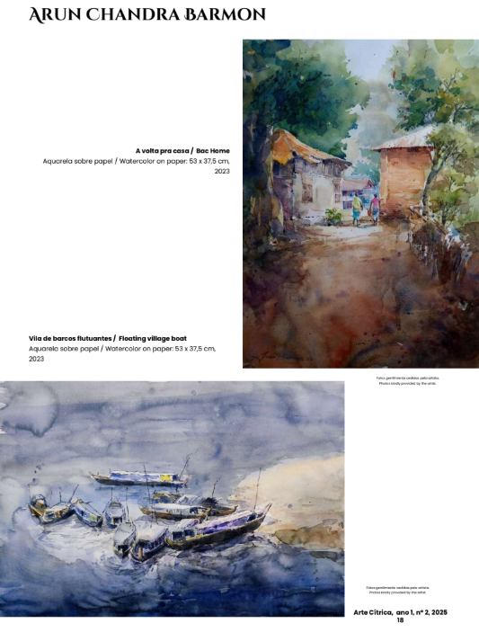 In this latest issue, youโll find my watercolor paintings Vila de barcos flutuantes and A volta pra casa. Through them, I wanted to show the world the peaceful beauty of Bangladeshโs landscapes and the heartbeat of our rural life.
