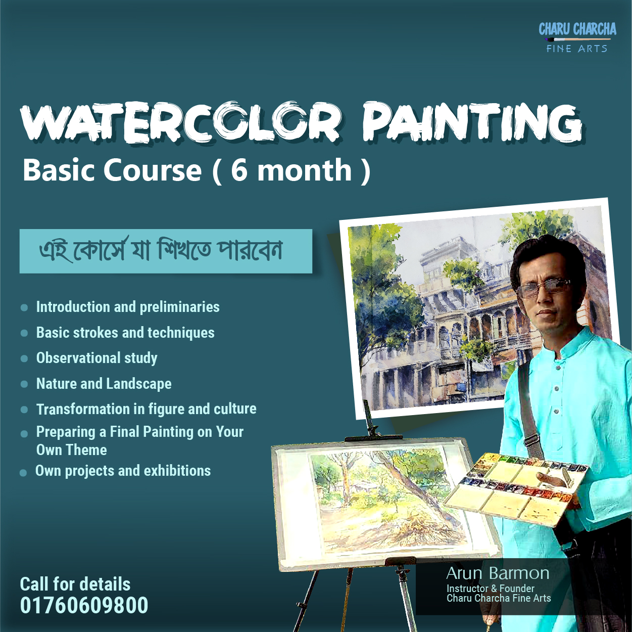 ওয়াটার কালার – বেসিক কোর্স (৬ মাস) বয়সসীমাঃ ১২ বছর থেকে যে কোনো বয়সীরা ক্লাস করতে পারবেন (Age Limit: 12 to any age)সময়কাল: ৬ মাস | সপ্তাহে ১ দিন ক্লাস | মোট ক্লাস: ২৪টিপ্রতিটি ক্লাসের সময়কাল: দেড় ঘন্টা (৯০ মিনিট)পাঠদান মাধ্যম: অনলাইন লাইভ ক্লাস সিলেবাস (Basic Syllabus) মাস ১: ভূমিকা…