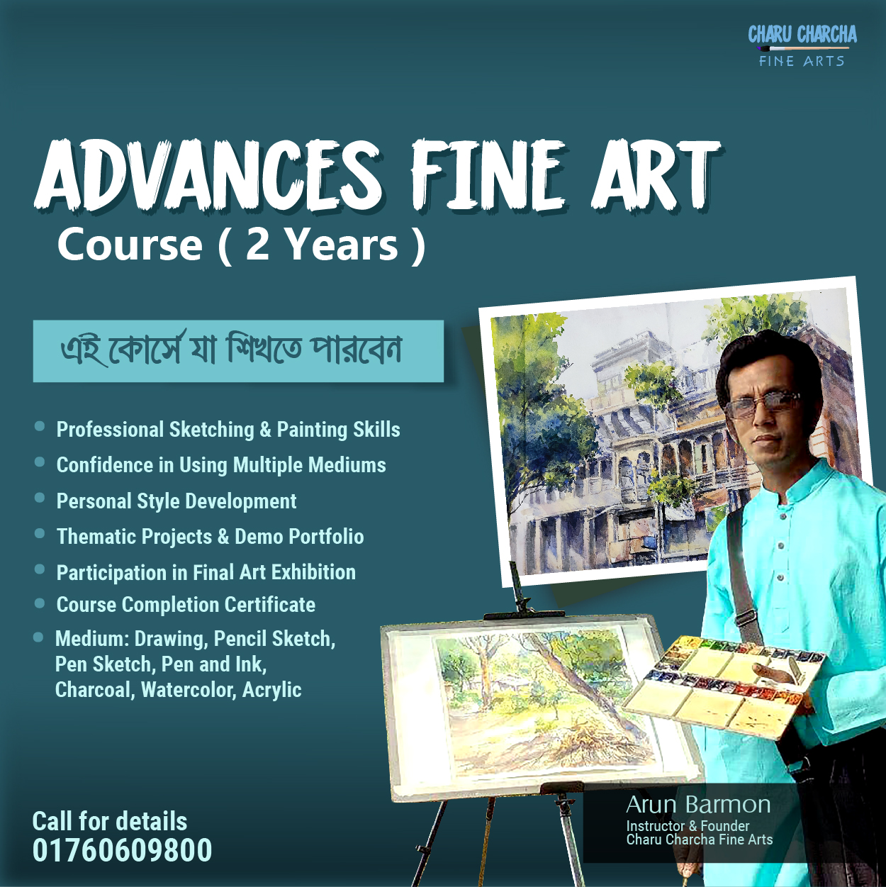 অ্যাডভান্স ফাইন আর্টস কোর্স (২ বছর) বয়সসীমাঃ ১২ বছর থেকে যে কোনো বয়সীরা ক্লাস করতে পারবেন (Age Limit: 12 to any age)সময়কাল: ২ বছর | সপ্তাহে ১ দিন ক্লাস | মোট ক্লাস: ৯৬ টিপ্রতিটি ক্লাসের সময়কাল: দেড় ঘন্টা ( ২ ঘণ্টা )পাঠদান মাধ্যম: অনলাইন অফলাইন ও লাইভ ক্লাস সাপ্তাহিক ও…