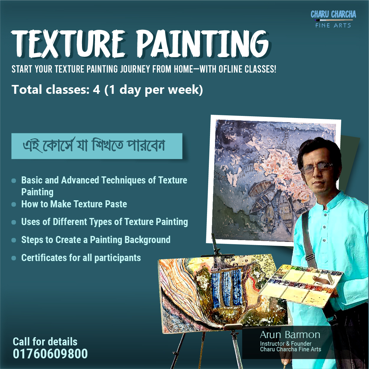 টেক্সচার পেইন্টিং ওয়ার্কশপ ২০২৫ শিল্পের নতুন অভিজ্ঞতার শুরু এখানেই! আপনার ক্যানভাসে রঙ আর টেক্সচারের জাদু ছড়িয়ে দিন আমাদের এক্সক্লুসিভ ওয়ার্কশপ ও অনলাইন কোর্সে অংশগ্রহণ কোরে! আয়োজক: Charu Charcha Fine Art আমাদের আয়োজন দুই ধাপে বিভক্ত: সকল অংশগ্রহণকারীদের জন্য সার্টিফিকেট রয়েছে Basic Texture Painting Online Course (অনলাইন) আপনার টেক্সচার পেইন্টিংয়ের যাত্রা…